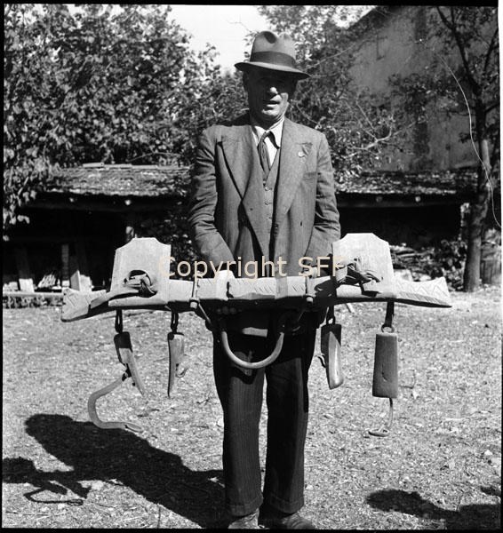 Ritratto di un informatore a Borgomanero in posa con un giogo intagliato