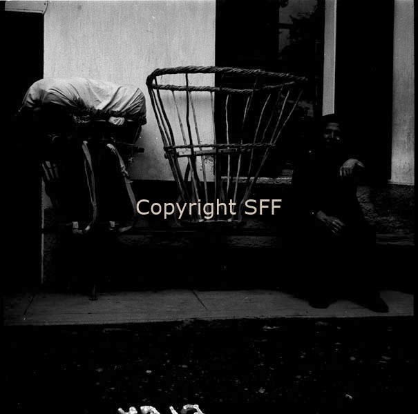 Ritratto di un informatore a Coggiola in posa accanto a una gerla carica e a una gerla vuota