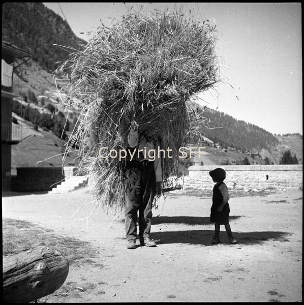 Ritratto di un informatore a Ghigo di Prali in posa con un carico di segale sulle spalle