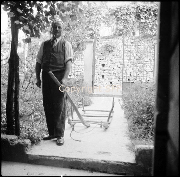 Ritratto di un informatore a Lezzeno in posa con una slitta per trasportare fieno