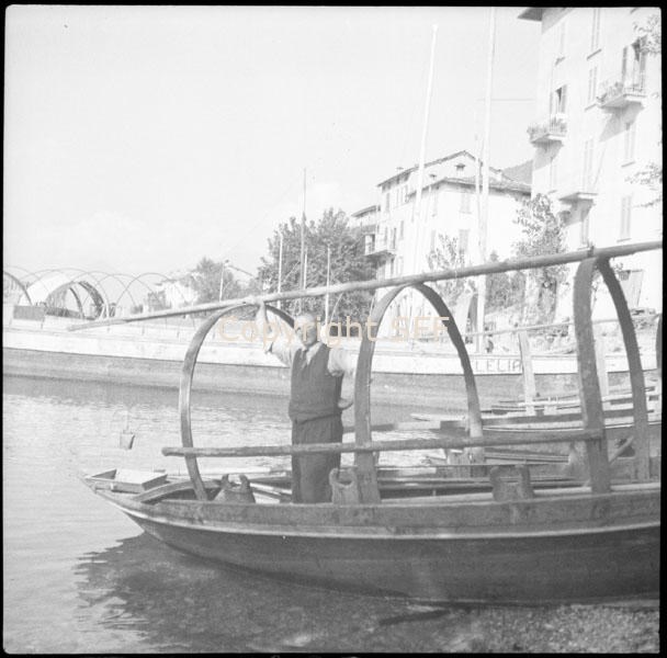Ritratto di un informatore a Lezzeno in posa in barca tirata a riva sul Lago di Como