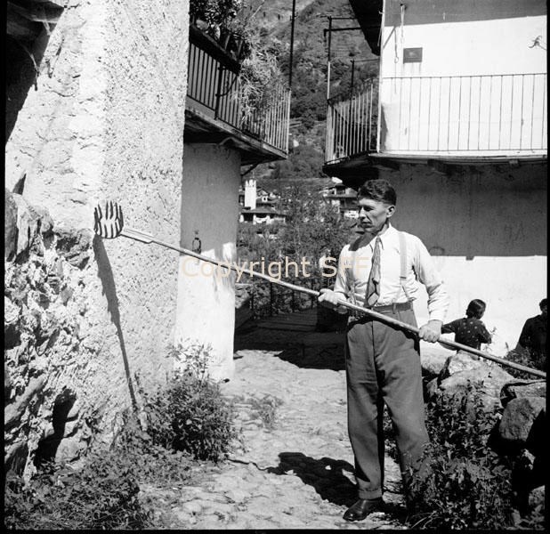 Ritratto di un informatore a Locana in posa con un raccoglifrutta
