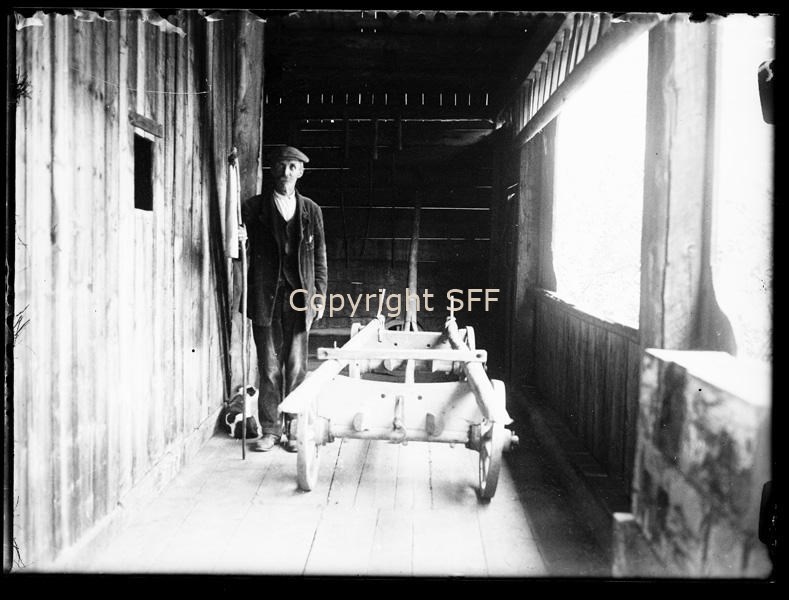 Ritratto di un informatore a Selva di Cadore accanto a un carro per il trasporto di legname o fieno