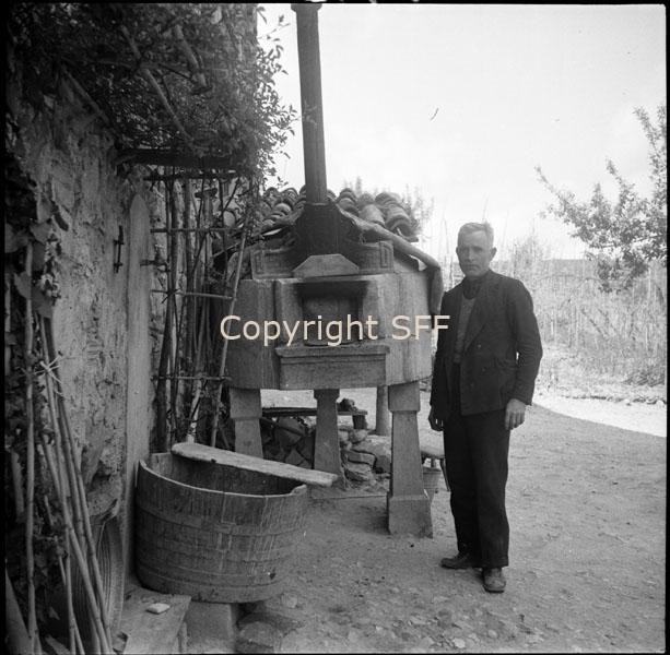 Ritratto di un informatore a Staghiglione di Borgo Priolo in posa accanto a un forno di cemento