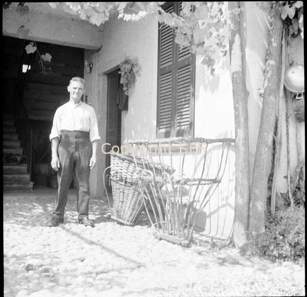 Ritratto di un informatore a Voltorre in posa accanto a due tipi diversi di gerla