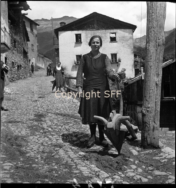Ritratto di un'informatrice a Precasaglio in posa con un aratro