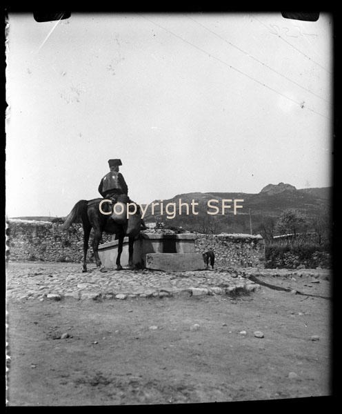 - Ritratto di uomo che indossa il costume locale e che monta un cavallo ripreso mentre il cavallo stesso si abbevera poco fuori dal paese