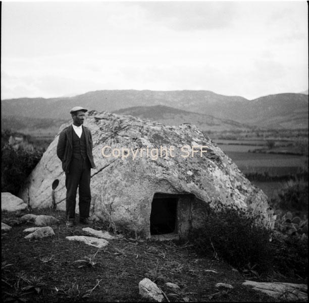 Ritratto di uomo di fronte a una domu de janas (domu de gianas)