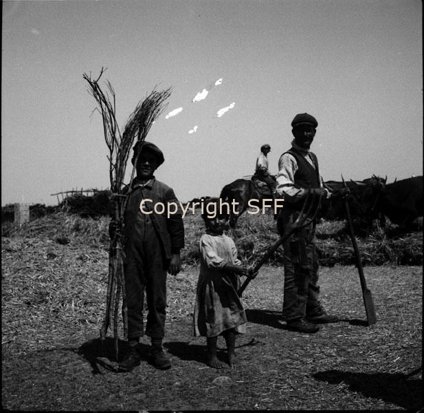 Ritratto di uomo e bambini con scopa, forca e pala