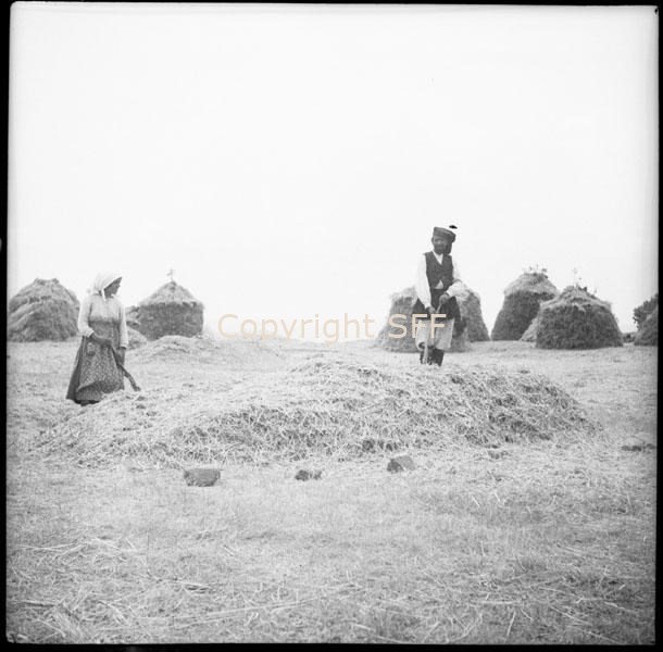 Ritratto di uomo in costume che paleggia mucchi d'orzo