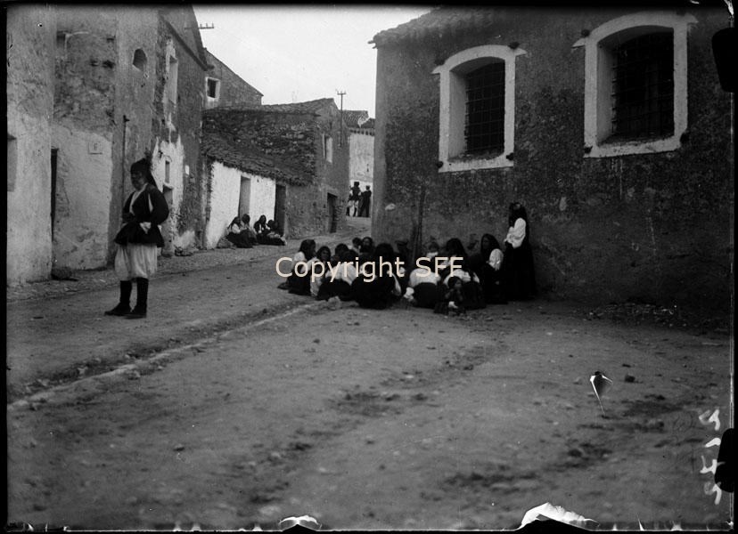 - Ritratto di uomo che indossa il costume locale e gruppo di donne sedute in circolo che giocano a tombola