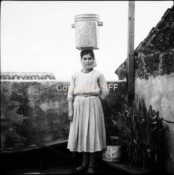 - Ritratto di donna che traporta sulla testa un recipiente cilindrico di latta utilizzato per la raccolta dell'acqua
