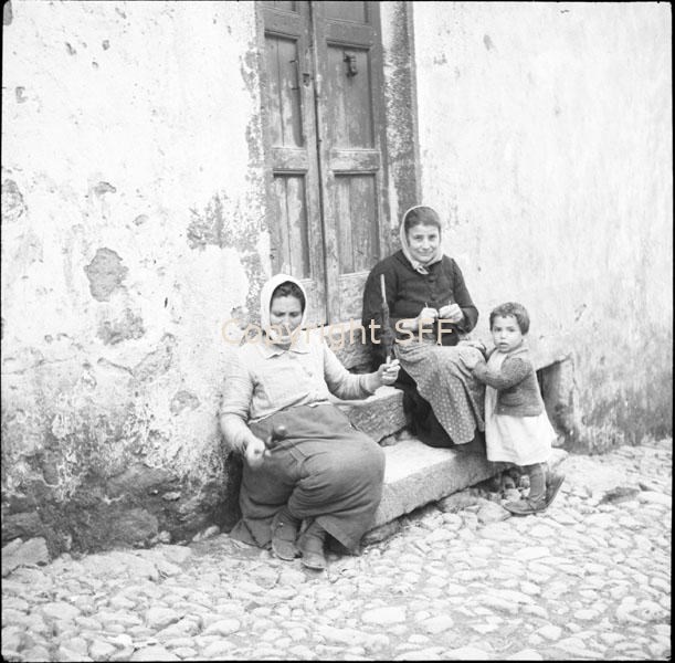 Ritratto di donne che filano sedute fuori dalla loro abitazione
