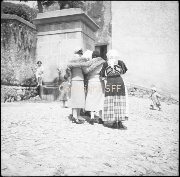 - Ritratto di donne riprese di spalle: una indossa il costume locale, le altre due indossano eleganti vestiti