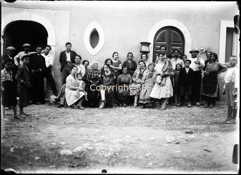 Ritratto di un gruppo di persone all'esterno di un'abitazione