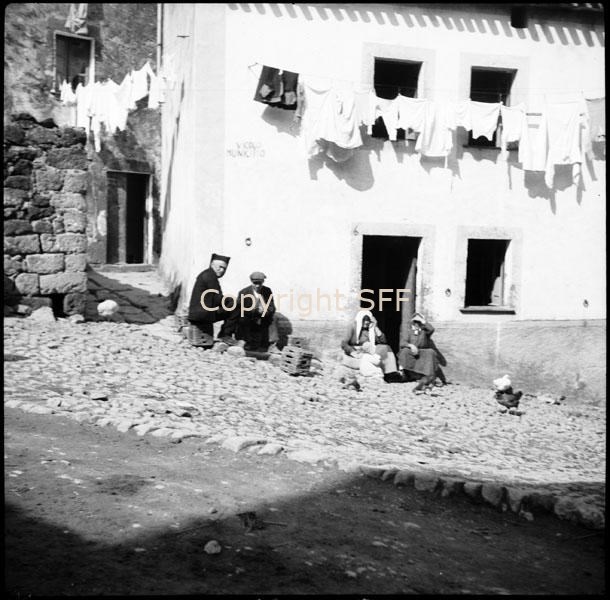 - Ritratto di gruppo di abitanti del paese seduti al sole fuori dalle loro abitazioni