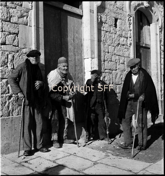 Ritratto di quattro anziani con scialli e sciarpe ricoperti di mosche