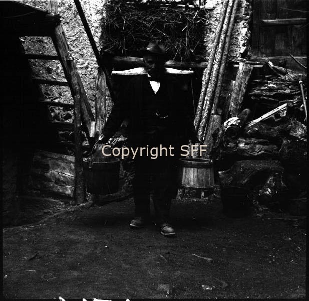 - Ritratto di uomo che porta sulle spalle un bilanciere alle cui estremità sono collocati due secchi di legno utilizzati per il trasporto dell'acqua