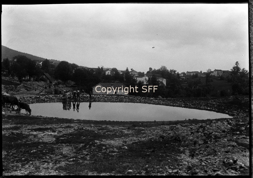 - Veduta sullo sfondo del paese e in primo piano abbeveratoio naturale