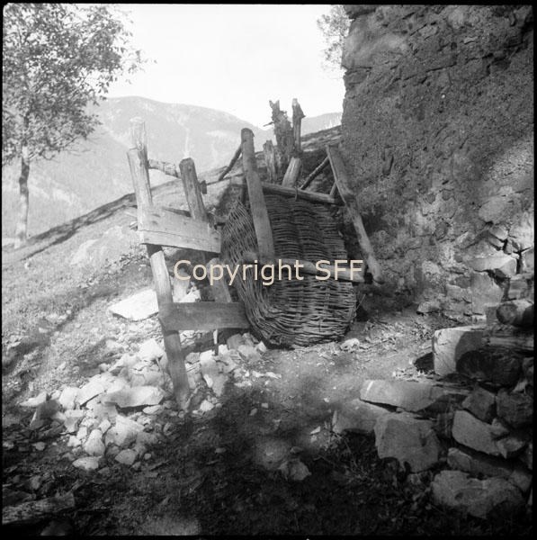 Slitta in legno da trasporto e cestone utilizzato per il trasporto di divers materiali