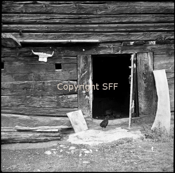 Stalla a Livigno: particolare della porta decorata con corna bovine