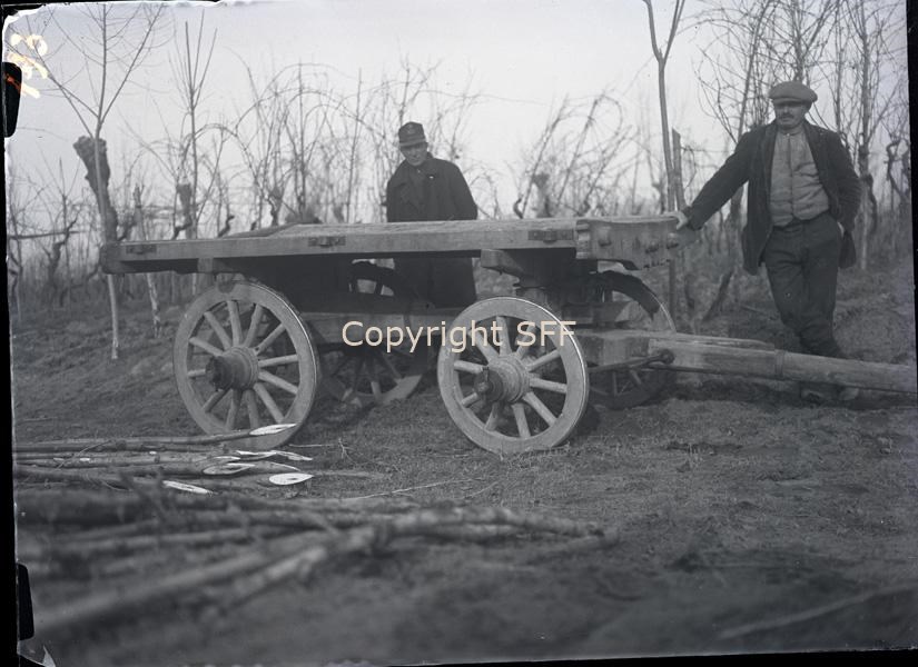 Carro da carico utilizzato per il trasporto della legna e due uomini di cui uno in divisa (non identificata)