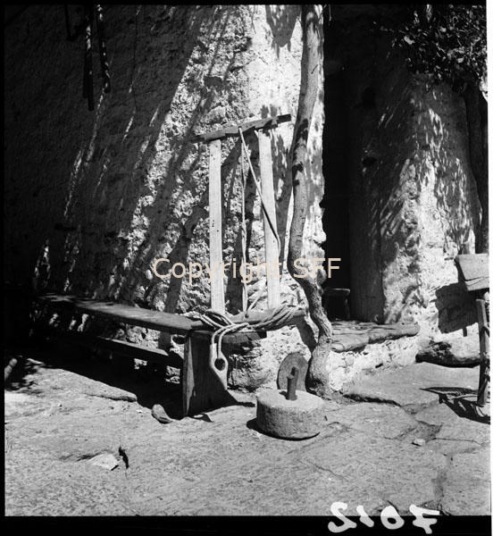Strumenti del lavoro agricolo: incudine e attrezzo per trasportare fieno