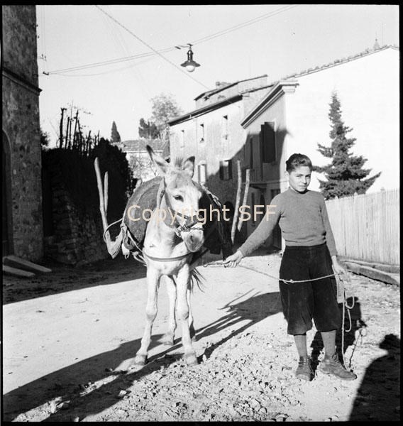 Asino con basto e uncini di legno utilizzati per il trasporto di diversi materiali; a fianco: ritratto di ragazzo che conduce l'asino