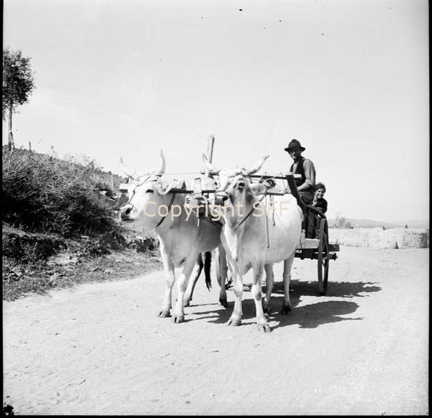 Attacco per buoi, carro da carico a due ruote e contadini sul carro