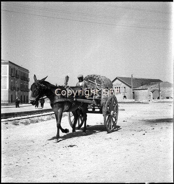 Carro da carico a due ruote con sponde laterali trainato da mulo e con visibile parte posteriore di cestone utilizzato nel trasporto dello zolfo