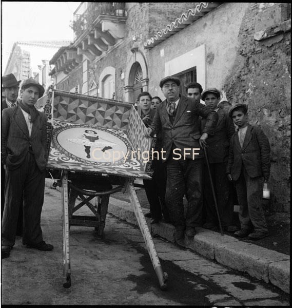 Decorazione raffigurante una ballerina sul fondo di un carro; a lato: il pittore Liotta (appoggiato a un laterale)