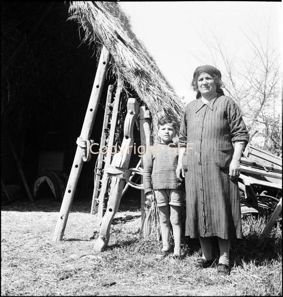 Giogo in legno dritto utilizzato per l'aratura, giogo in legno curvo utilizzato per il traino del carro; a fianco: ritratto di contadina e del figlio