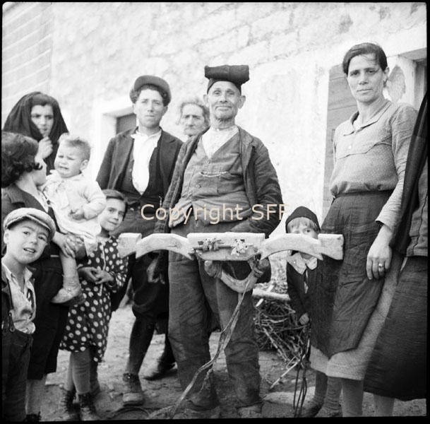 Ritratto di gruppo di alcuni abitanti del paese; davanti a loro un giogo in legno per buoi
