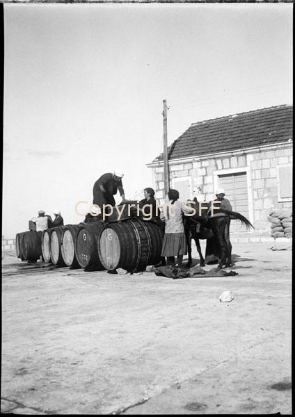 - Riversamento del vino contenuto nelle otri attraverso la pevera (grosso imbuto di legno con becco di metallo) nelle botti