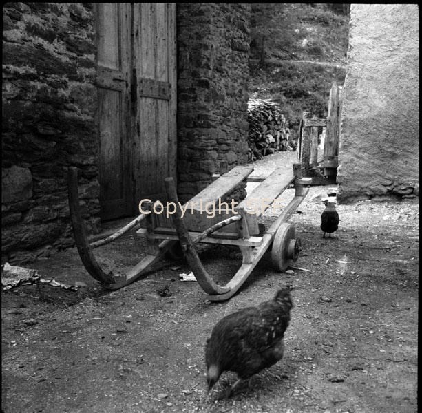 Slitta in legno con ruote utilizzata per il trasporto di diversi materiali