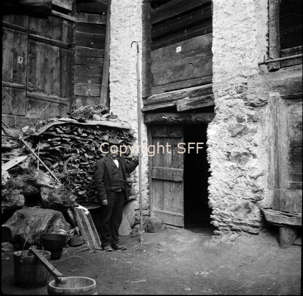 - Ritratto dell'informatore che tiene in mano una pertica in legno con uncino finale utilizzata per la piegatura dei rami secchi