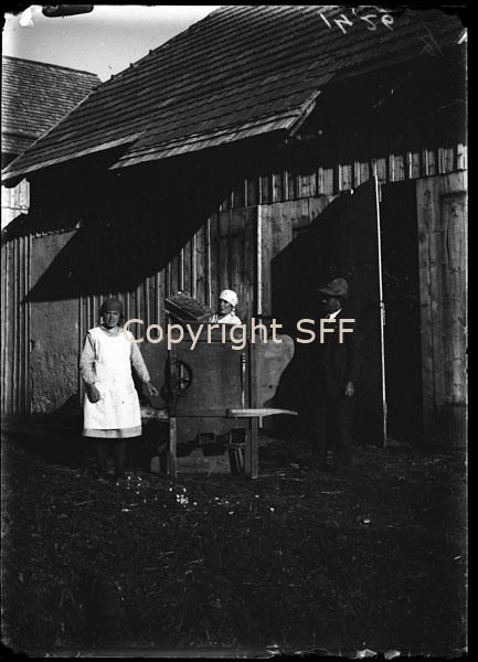 Due donne e un uomo ritratti accanto ad uno strumento del lavoro agricolo