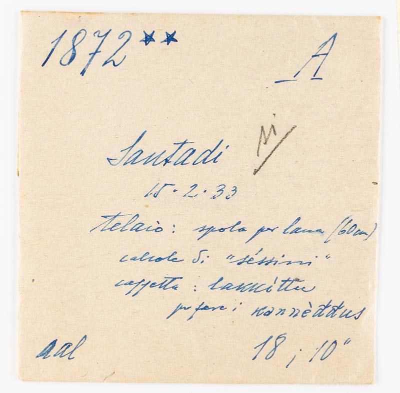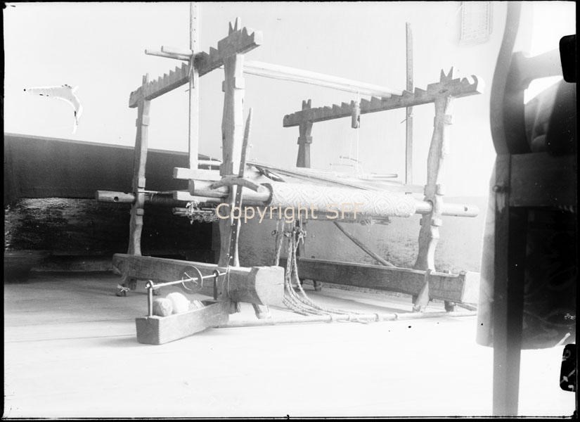 - Telaio in legno: Telaio in legno composto da alcuni elementi: la spola per la lana (60 cm); la carrucola: ("konğò"); le calcole: ognuno dei regoli manovrati da pedali che servono ad aprire e chiudere i fili dell’ordito; la cassetta ("lakkìttu") dei cannelli: rocchetti su cui è avvolto il filo all’interno di una spola; il ferro con la rotella ("impiròĭu")