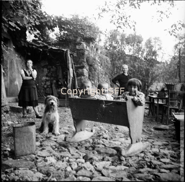 Tre bambini in posa in una culla di legno