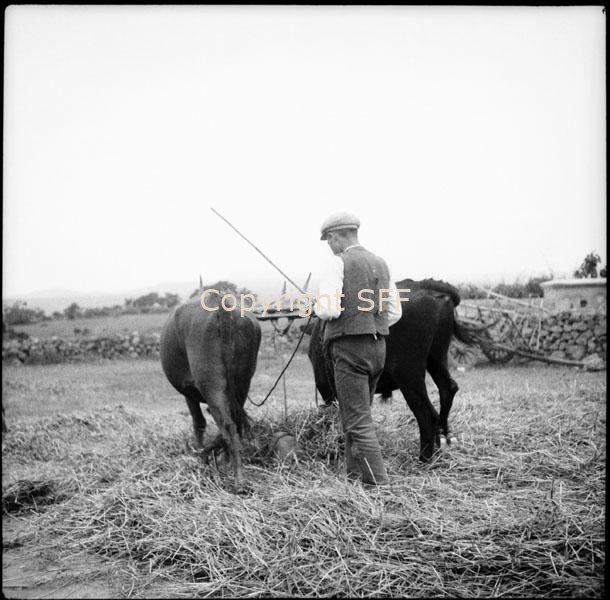 Trebbiatura delle fave mediante l'utilizzo di buoi e della pietra da trebbio