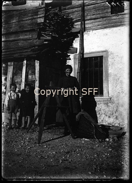 Un treppiede in legno utilizzato come appoggio per caricare la gerla di letame