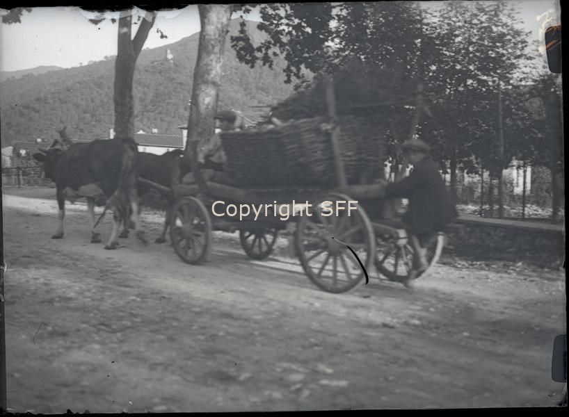Un carro trainato dai buoi per il trasporto del legname condotto da due ragazzi