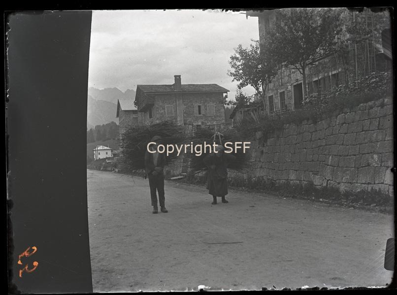 Una donna e un ragazzo trasportano fascine di legna con la "refe"