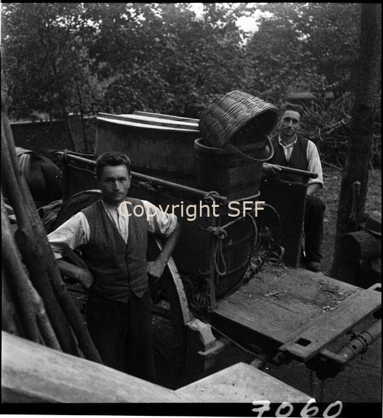 Uomini in posa con strumenti del lavoro agricolo