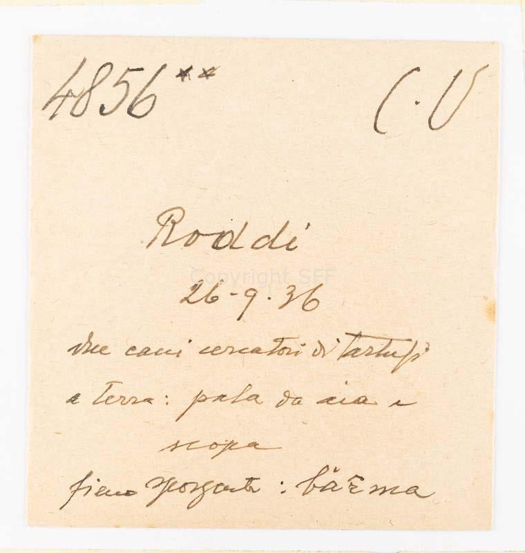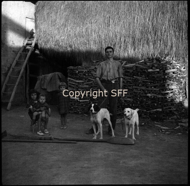 Uomo con cani da tartufo e bambini accanto a strumenti del lavoro agricolo