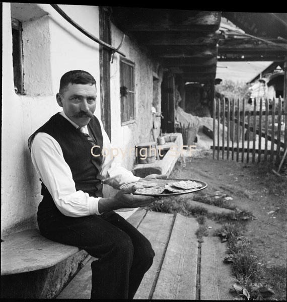 Uomo con piatto di pani ripieni