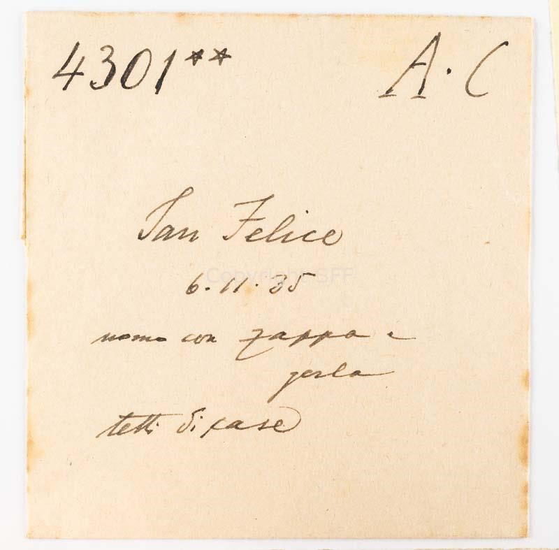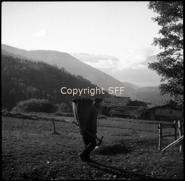Ritratto di uomo con gerla sulle spalle e zappa in mano