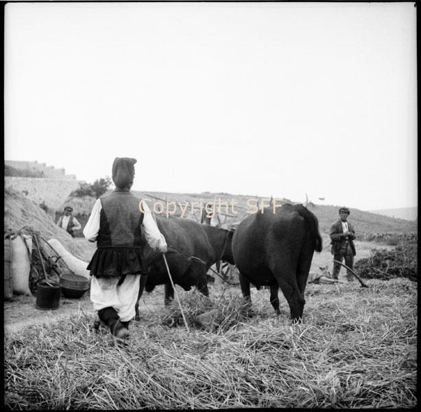 Uomo in costume che accompagna i buoi durante la trebbiatura