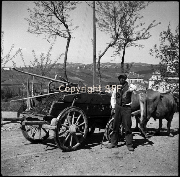 Uomo in posa accanto a un carro che trasporta un aratro moderno (Olivieri)