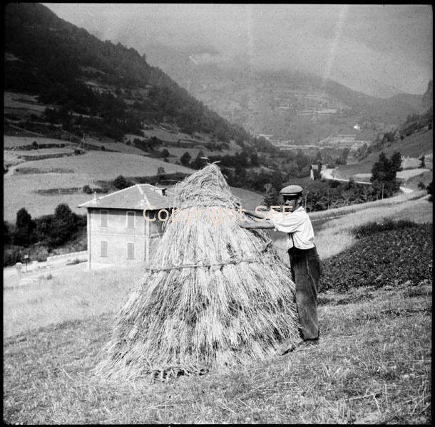 Uomo in posa accanto a una bica di mannelli di segale